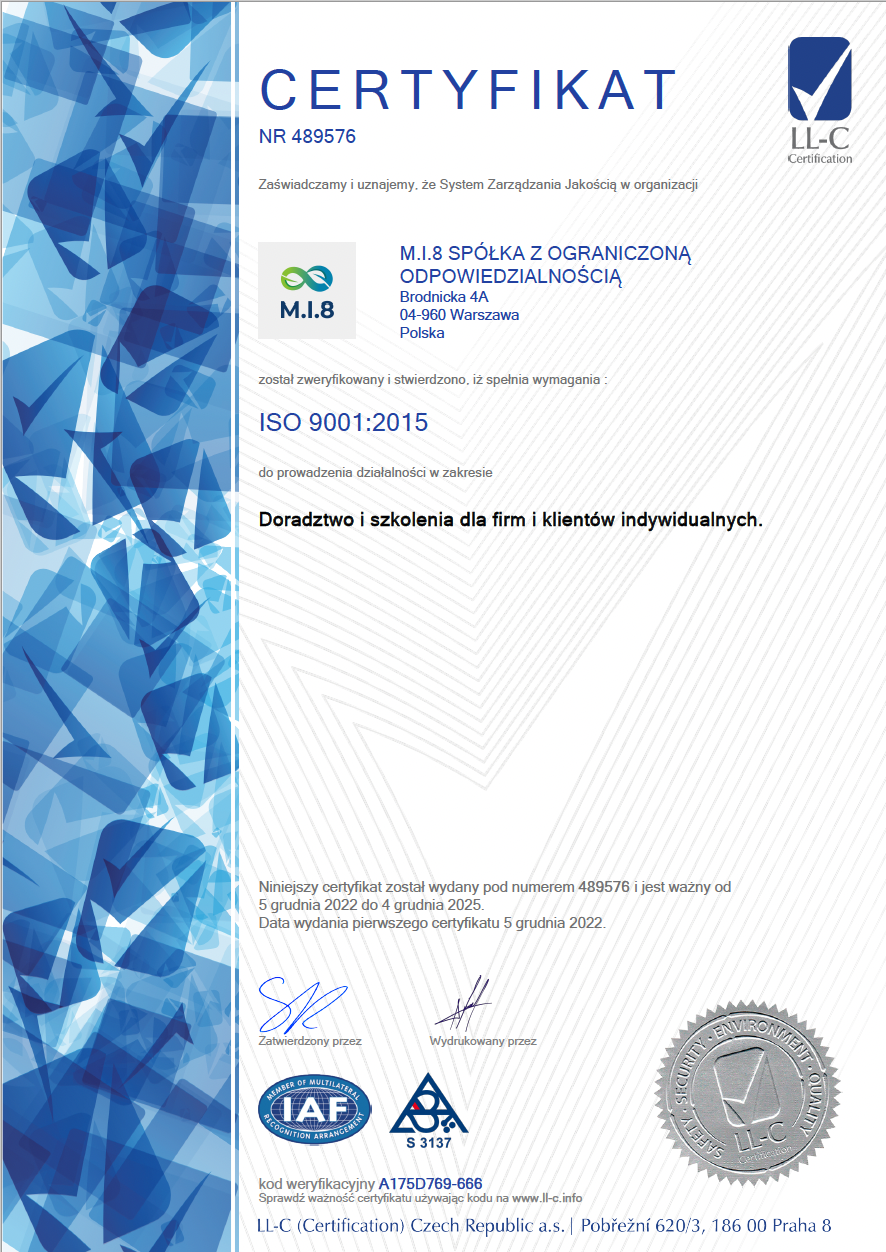 Naszym priorytetem jest wysoka jakość usług. M.I.8 posiada wdrożony system wewnętrznej kontroli jakości, zgodnie z wymaganiami wynikającymi z Międzynarodowego Standardu Kontroli Jakości. System zapewnienia jakości usługi realizowanych zgodnie z przedmiotem działalności. Wewnętrzny system kontroli jakości oparty jest na następujących komponentach: